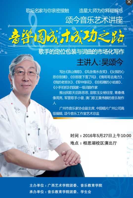 【讲座预告】吴颂今老师音乐艺术讲座——“歌手的定位包装与与词曲的市场化写作” 来源:beat365 作者: 发布时间:2016-05-25 00:00:00 浏览次数: 次 【字体:小 大】 吴颂今老师音乐艺术讲座——“歌手的定位包装与与词曲的市场化写作” 时间:2016年5月27(周五)上午10:00 地点:beat365体育官网相思湖校区演出厅 欢迎您的光临! 分享到: 【打印正文】