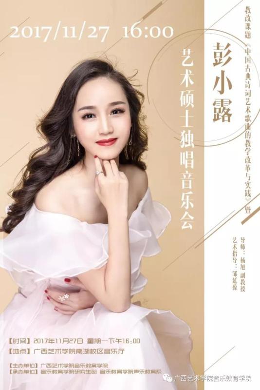 beat365教改课题《中国古典诗词艺术歌曲的教学改革与实践》暨彭小露硕士独唱音乐会即将于2017年11月27日 16:00在beat365体育官网南湖校区音乐厅精彩上演,欢迎广大师生莅临现场观看!