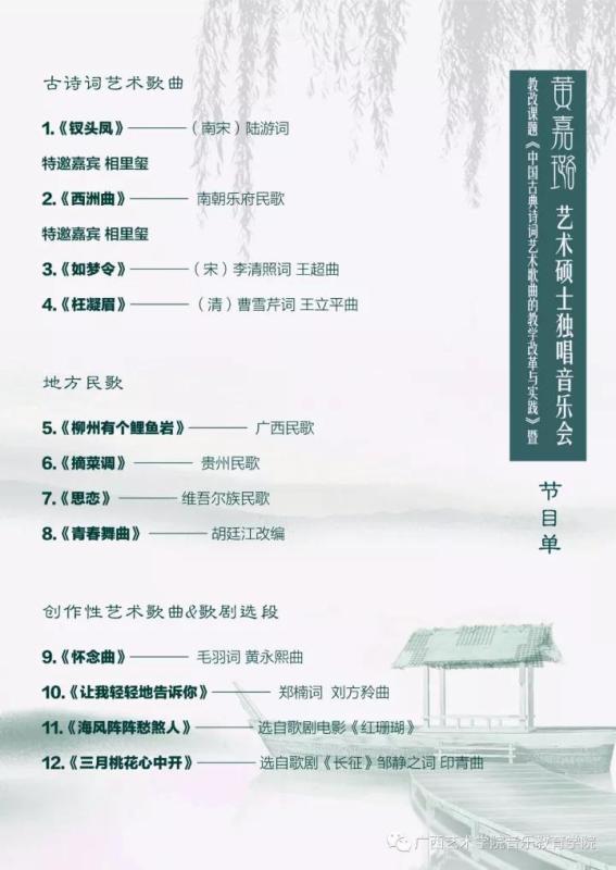 【音乐会预告】教改课题《中国古典诗词艺术歌曲的教学改革与实践》暨黄嘉璐艺术硕士独唱音乐会 来源:beat365 作者:beat365 发布时间:2017-11-29 12:50:25 浏览次数: 次 【字体:小 大】 beat365教改课题《中国古典诗词艺术歌曲的教学改革与实践》暨黄嘉璐艺术硕士独唱音乐会即将于2017年12月1日 下午16:00在beat365体育官网南湖校区音乐厅精彩上演,欢迎广大师生莅临现场观摩! 节目单 审核丨聂玫 编辑丨罗淑雯 分享到: 【打印正文】