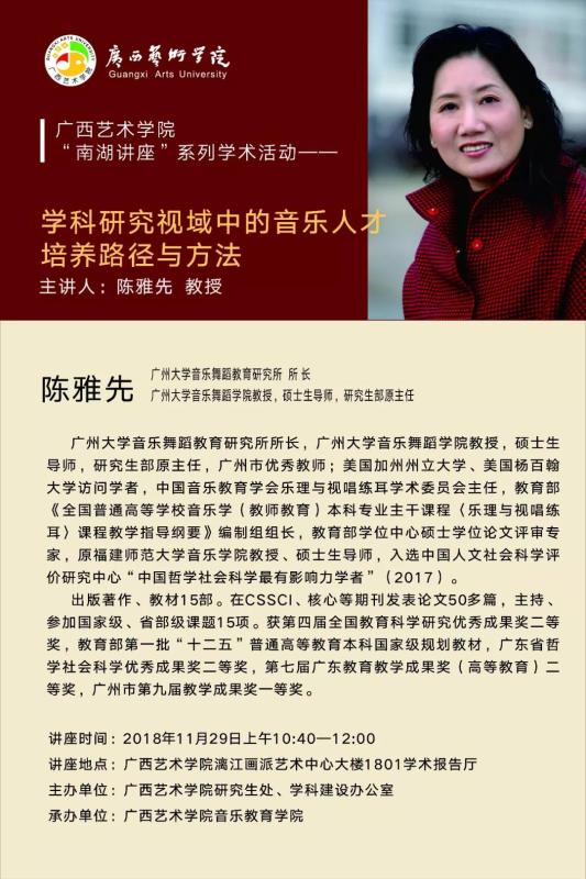 【讲座预告】beat365体育官网“南湖讲座”系列学术活动——陈雅先教授主讲《学科研究视域中的音乐人才培养路径与方法》