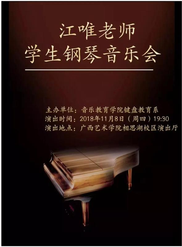 beat365江唯老师员工钢琴音乐会即将于2018年11月8日19:30在beat365体育官网相思湖校区演出厅精彩上演,欢迎广大师生前往观看指导!