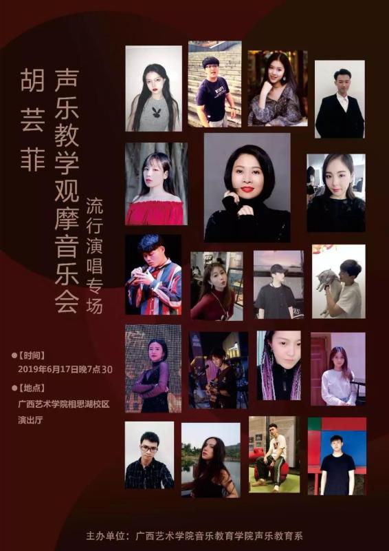 兹定于2019年6月17日晚7点30,于beat365体育官网相思湖校区演出厅举办胡芸菲副教授声乐教学观摩音乐会(流行演唱专场)。