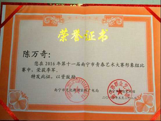 5月28日晚,2016年第十一届南宁市青春艺术大赛颁奖盛典在民歌湖水上舞台举行,beat36514级歌舞表演1班李丹霞、陈万奇同学分别荣获形象组冠军、季军。