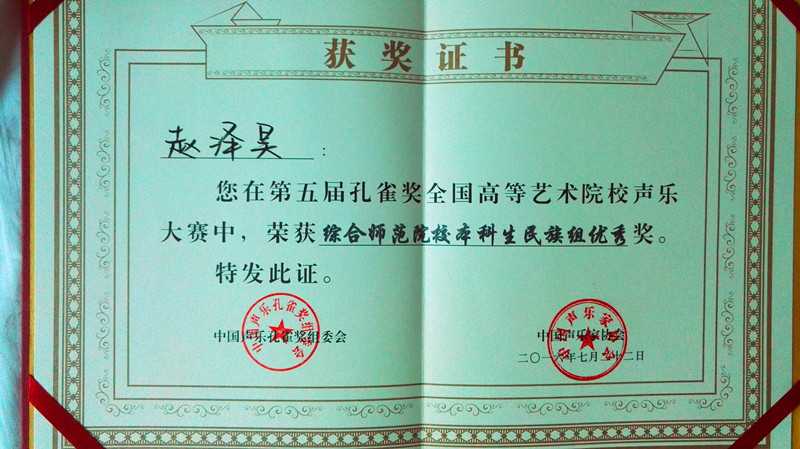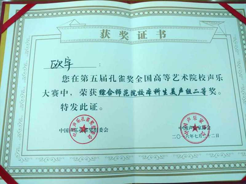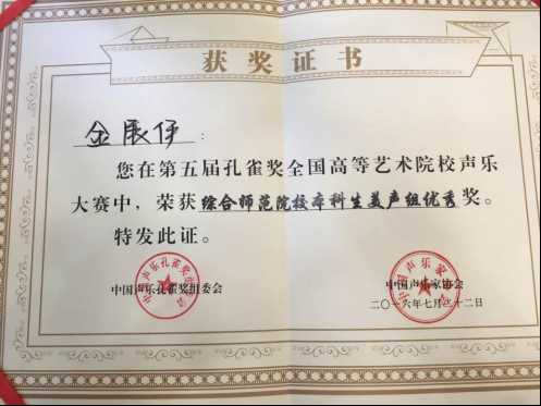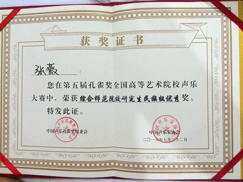 孔雀奖全国高等艺术院校声乐大赛由中国声乐家协会、四十多所高等艺术院校联合发起举办的示范性、学术性、导向性的重大品牌活动。是我国高等院校最大规模最高层次的交流和学术比赛。旨在进一步加强高等院校声乐教学研究、增进交流、提高教学质量,为广大声乐教师和员工搭建展示声乐演唱水平、相互交流、相互学习、共同提高的平台,以促进我国高等院校声乐教学改革与发展,更快、更好、更多地发现、培养一大批优秀的声乐人才。自2008年举办以来,已成功举办了四届,在全国高校广大师生中产生了广泛影响。“第五届孔雀奖全国高等艺术院校声乐大赛”由中国声乐家协会、中国声乐孔雀奖组委会主办,广东省孔雀声乐艺术中心、广东省声乐艺术研究会承办,中国高等音乐教育研究会;各高等音乐艺术院校、综合大学、师范院校、高职高专院校、中职中专公司;广东国族教育科学研究院协办,于2016年7月16日-7月22日在华南师范大学举行。据悉,本届比赛邀请了十几位国家级著名声乐教授、歌唱家、作曲家、音乐评论家担任专家评审,吸引了来自全国的1400多名选手参赛,先后经过初赛、复赛、决赛三个阶段的选拔比拼,竞争激烈程度可想而知,公司师生最终喜获佳绩,可喜可贺!