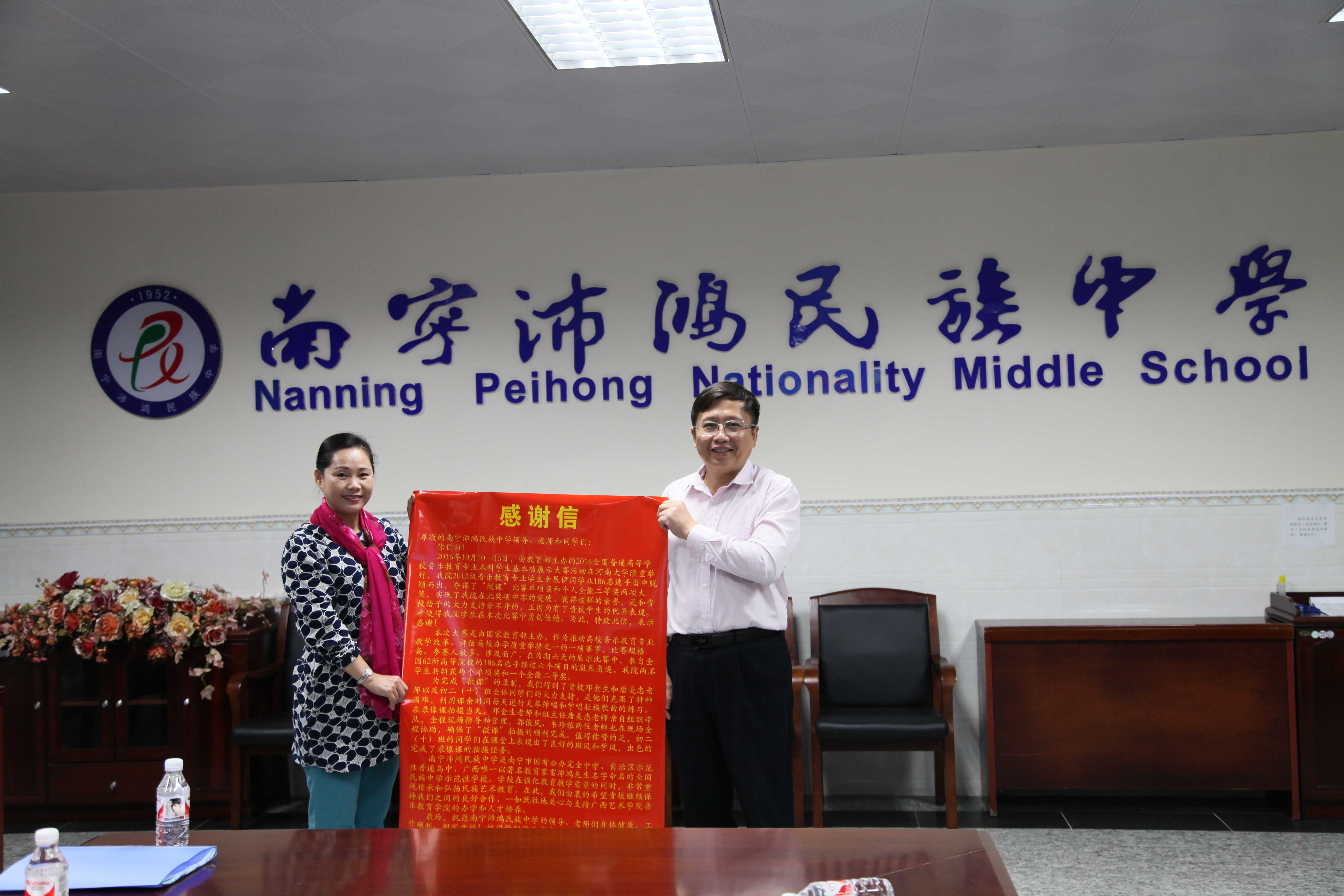 公司姚冰副经理向南宁沛鸿民族中学罗昌民董事长呈递感谢信