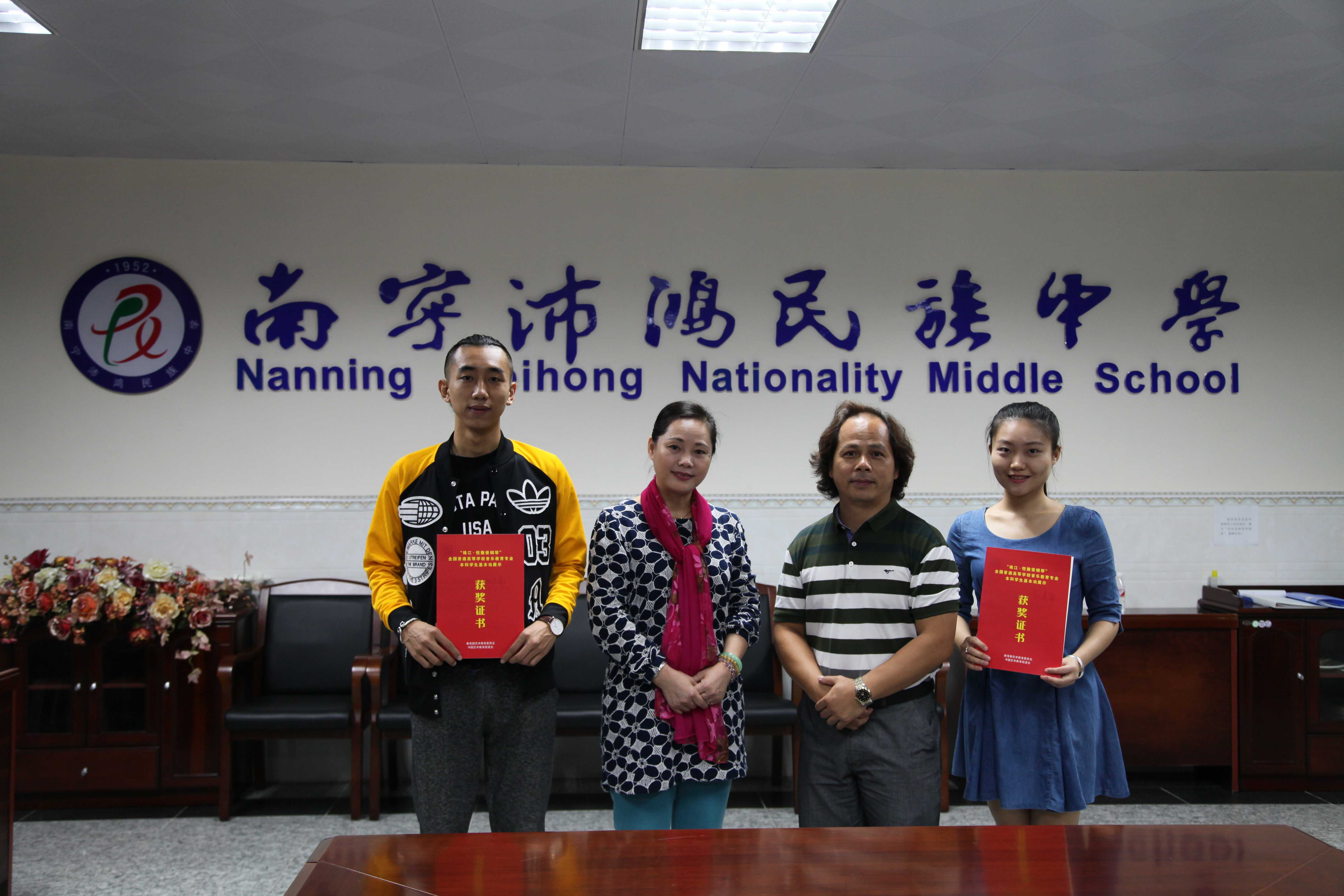 获奖同学金展伊、谭建栩与指导教师姚冰、邓金生合影