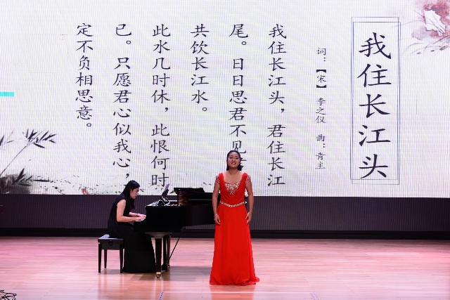 陈毅彬教授在演出开始前简单给大家介绍了关于中国古诗词声乐的特点,接着便以一首《枫桥夜泊》拉开了音乐会的序幕。在第二个节目中,陈教授先是请研究生唱了《花非花》这首古诗声乐作品,并进行了现场点评,她表示演唱古诗词声乐时要平仄律动、字腔清朗,把握神韵,深情并茂。在接下来的《阳关三叠》《点绛唇·赋登楼》《关雎》《峨眉山月歌》《如梦令》《大江东去》《我住长江头》等作品中,陈教授都对表演的员工们进行了细致的点评和范唱,还不时地跟现场的观众互动。在音乐会最后,陈教授为大家深情演唱了一首《春花秋月何时了》,得到了现场观众热烈的掌声。