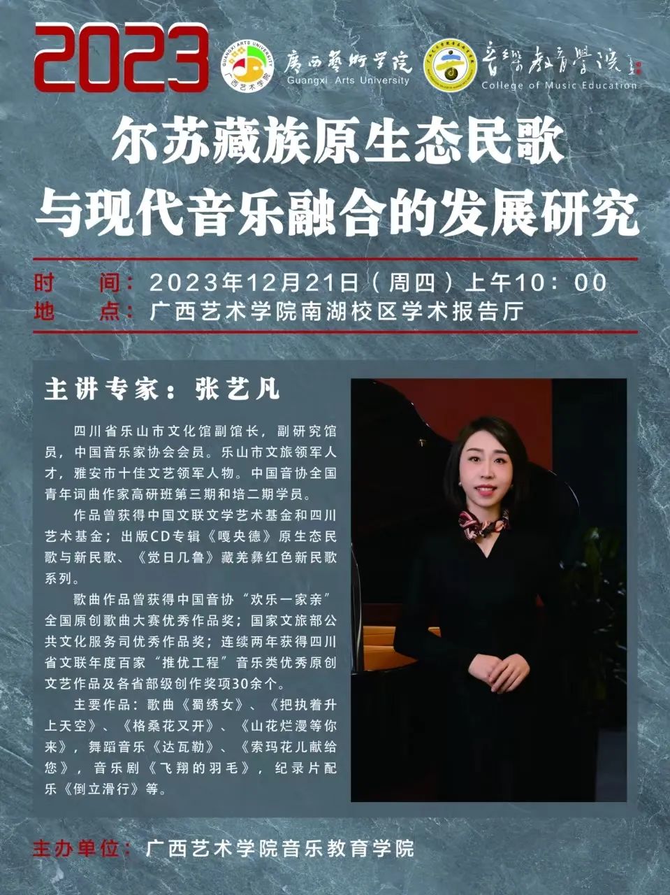 【2023学术活动预告】尔苏藏族原生态民歌与现代音乐融合的发展研究 来源:beat365 作者: 发布时间:2023-12-20 12:40:56 浏览次数: 次 【字体:小 大】 尔苏藏族原生态民歌与现代音乐融合的发展研究主讲专家:张艺凡时间:2023年12月21日(周四)上午10:00地点:beat365体育官网南湖校区学术报告厅尔苏藏族原生态民歌展演节目单 1.觉里曼姆表演者:苏正琼、王丽梦、洛桑妮玛、王勇 2.勒思泽(洗簸箕)表演者:苏正琼、王丽梦、唐伟欣 3.萨里昂多曼表演者:姜英、洛绒、山丹梅 4.情歌表演者:洛桑妮玛、唐伟欣 5.阿瓦尕(蜜蜂报信)表演者:王丽梦、唐伟欣 6.哭嫁歌表演者:苏正琼、王丽梦 7.母亲表演者:苏正琼、唐伟欣 8.瓦曼依哇表演者:全体女同志 9.喔呀哩勒表演者:苏正琼、姜英、吴迎霞、骆平 10.劳动歌表演者:洛桑妮玛、王勇、姜英、洛绒 11.迎客歌表演者:姜英、洛绒、山丹梅新民歌展演节目单 1.环山鸡节歌(改编:陈川)表演者:洛桑妮玛、王勇 2.祈祷(改编:韩兆云)表演者:洛桑妮玛 3.格桑花又开(作词:刘柏峻 作曲:张艺凡)表演者:洛桑妮玛、王勇、洛绒 4.心手相牵(作词:刘柏峻、山丹梅 作曲:张艺凡)表演者:王丽梦、洛绒 5.阿妈的勒思泽(改编:张艺凡)表演者:王丽梦、唐伟欣、洛绒、姜英 终审:戴丽霞 初审:赵海生 编辑:窦晟元 文案:beat365“蒲公英”记者团 分享到: 【打印正文】